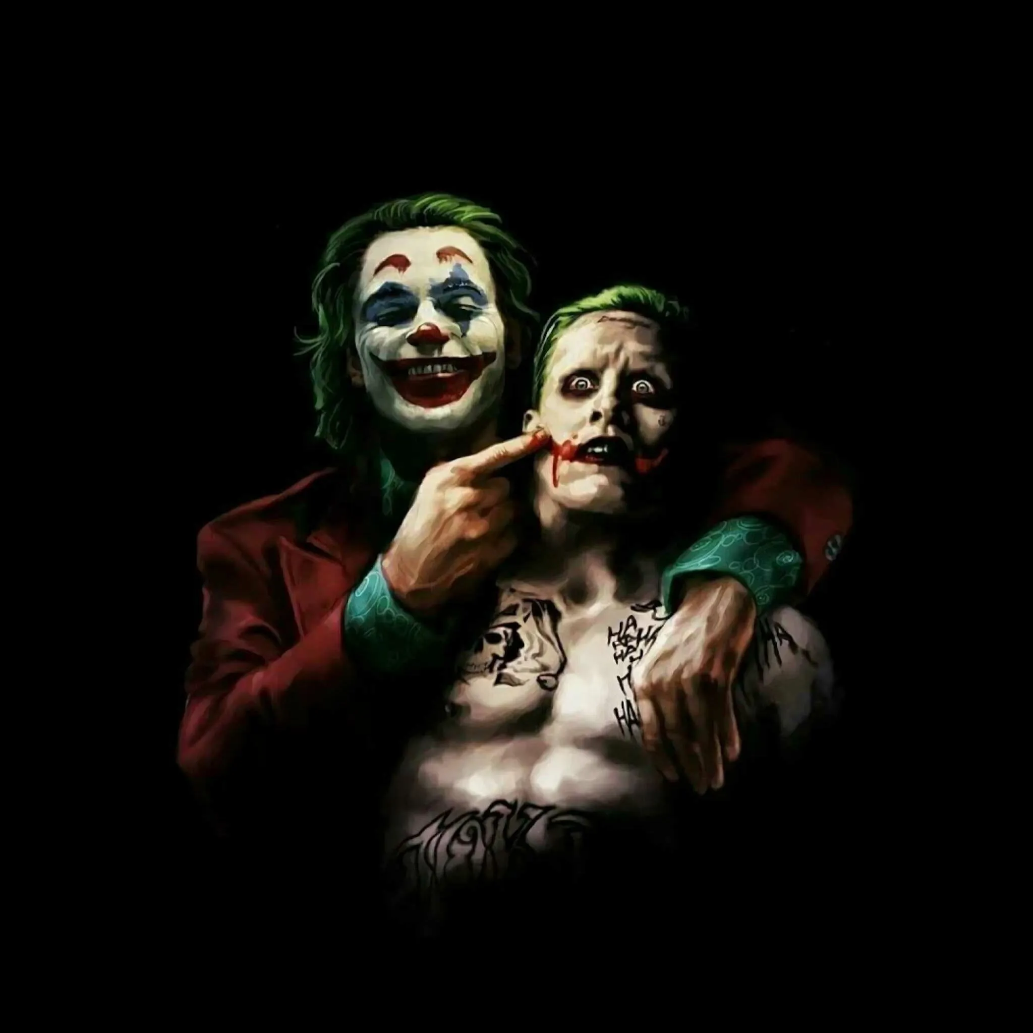U praznini gothamskih sjena Arthur Fleckov Joker drži Leto Jokera, prisiljavajući ga na groteskni osmijeh. „Širi osmijeh! Gotham voli predstave,“ podrugljivo kaže Arthur. Leto Joker se migolji: „Polako, frende, razmazat ćeš mi ruž!“ Arthur se smije: „To nazivaš šminkom? Da vidimo tko je pravi Princ Klaunova.“ Obojica su spremni nadmudriti Batmana ove noći.