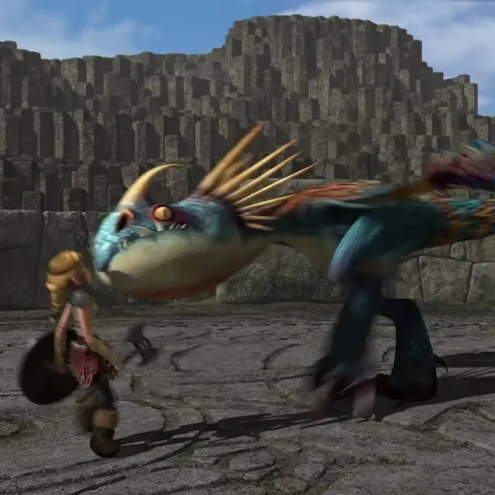 Među bazaltnim stupovima Astrid čvrsto drži štit. „Spremna za gađanje, Noder?” nasmiješi se. Noder zadrhti bodljama. „Danas prestižeš Bezubicu!” zadirkuje Astrid. Noder izbacuje bodlju. „Pogođeno! Sljedeće—zmajski poligon s preprekama!”