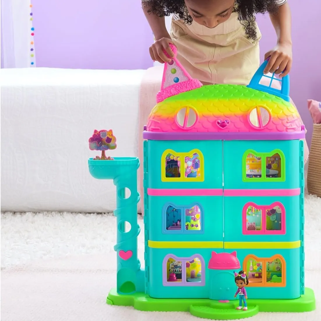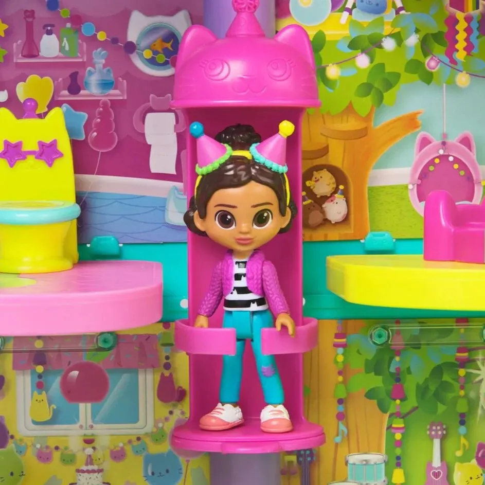 Gabby's Dollhouse Celebration Purrfect Dollhouse djecu vodi ravno u Gabbyin čarobni svijet. Šest šarenih soba, funkcionalno mačje dizalo, krovno igralište i zvukovi iz serije omogućuju beskrajne priče i zabavu. Set sadrži Gabby, DJ stol, luk od balona i iznenađenja za maštovite igre.