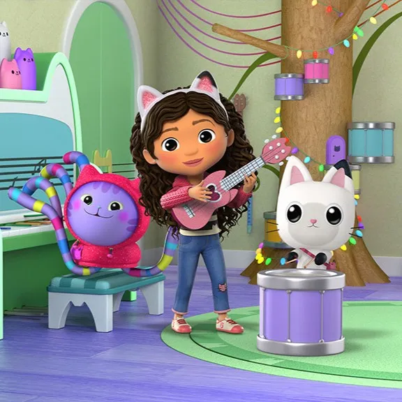 U glazbenoj sobi Gabby svira ružičastu gitaru. „Spreman za naš mačji koncert, Pandy Paws?” nasmiješi se. Pandy Paws skače po bubnju: „Vježbam svoje mjau-perkusije cijelo jutro!” DJ Catnip namješta naočale. „Dodajem funky ritam!” Zajedno se smiju i počinju vježbati za večerašnji nastup u kućici.