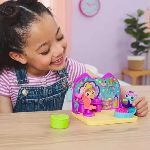 Set Gábinin kouzelný domek Spa vodi djecu u svijet Gabi i njezinih mačjih prijatelja. Rybočku mogu kupati u kadi s mjehurićima, vrtjeti je u spa-stolcu i sušiti joj kosu slatkim sušilom. Mijenjajuća pozadina i cvjetna kruna čine svaku igru novom pustolovinom.