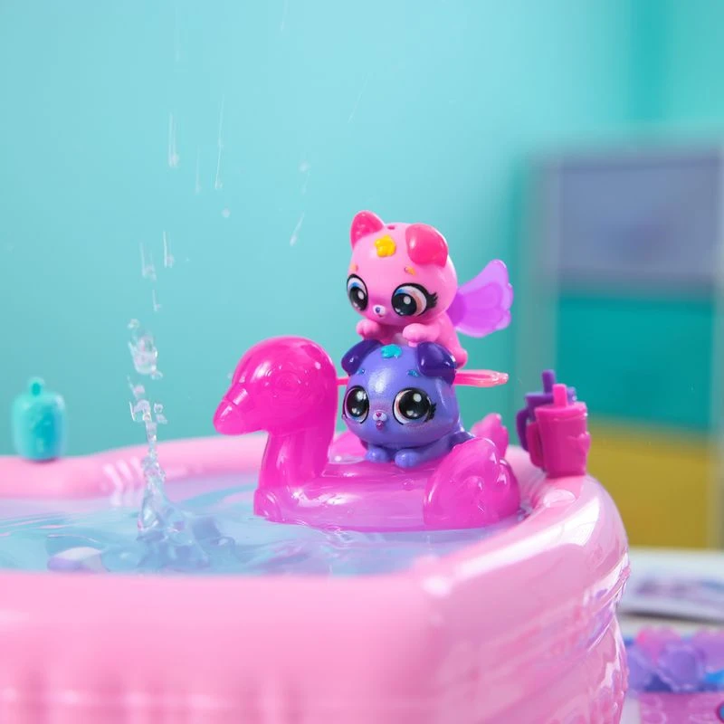 Set Hatchimals Bazen Party spaja iznenađenje i kreativnost - neonska jaja se izlegu u vodi i otkrivaju dvije slagive Puppadee figurice. Uz 14 dodataka, poput flaminga ili sunčanih naočala, djeca mogu svaki put izmisliti novu bazensku priču.
