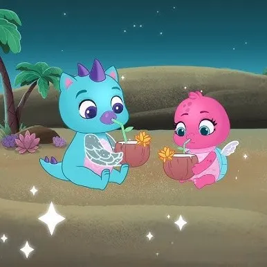Među blistavim palmama plavi zmaj srče: „Ovaj kokos je gotovo sladak kao tvoje šale!” Ružičasta ptica se smije: „Čekaj da vidiš moj ples!” Kucnu se pićima, krila zatrepere. „Spremna pronaći izgubljene duge školjke u šumi Fabula?” „Tko će prvi!” Već jure kroz čarobnu noć.