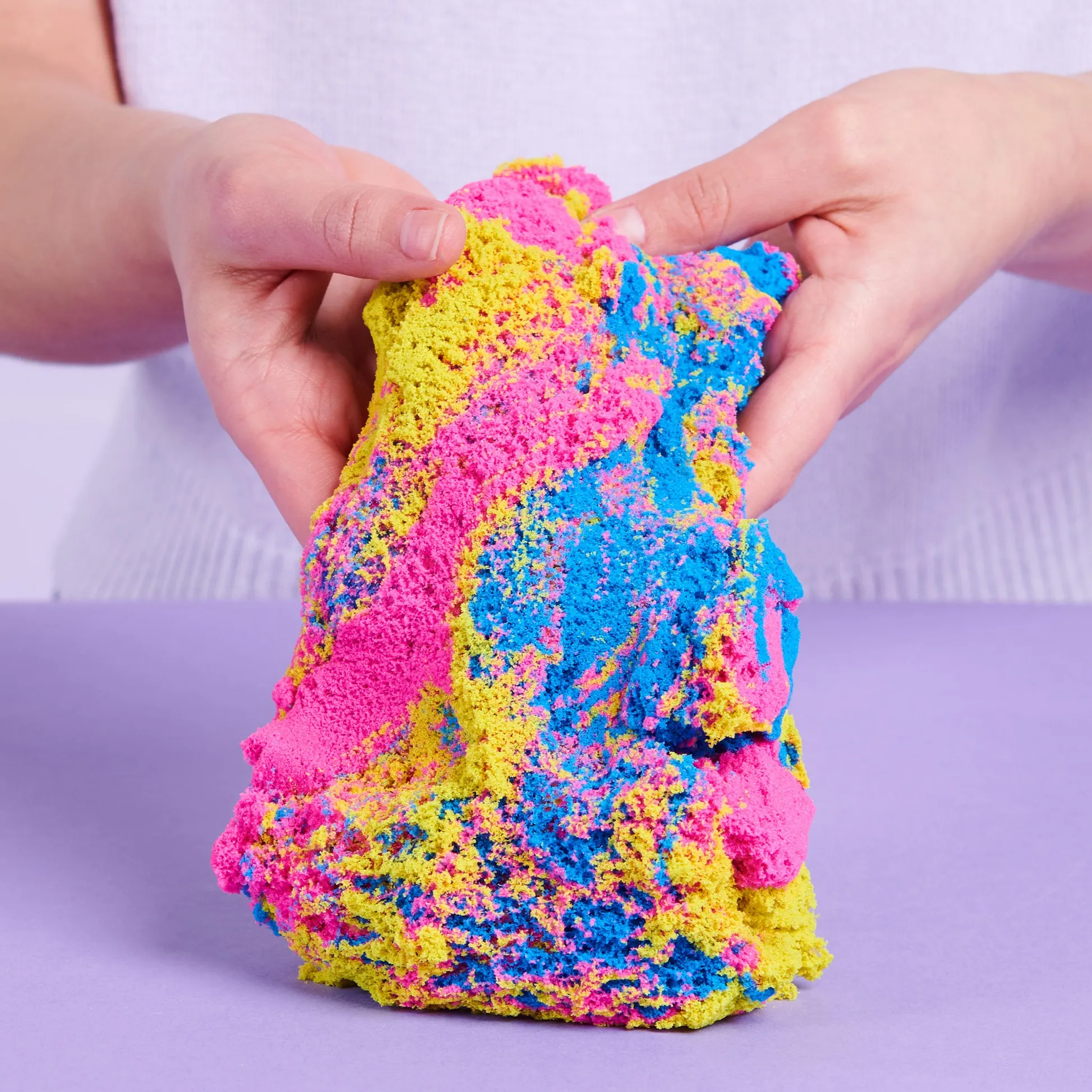 Na lavandinom stolu Mia prstima utiskuje vrtlog ružičastog, plavog i žutog Kinetic Sanda. „Pogledaj, radim pješčanu pizzu!” smije se, režući klimavi trokut. Brat Max se nasmije: „To je najpješčanija pizza koju sam vidio!” Zajedno se spremaju izgraditi najviši, najklimaviji pješčani toranj.