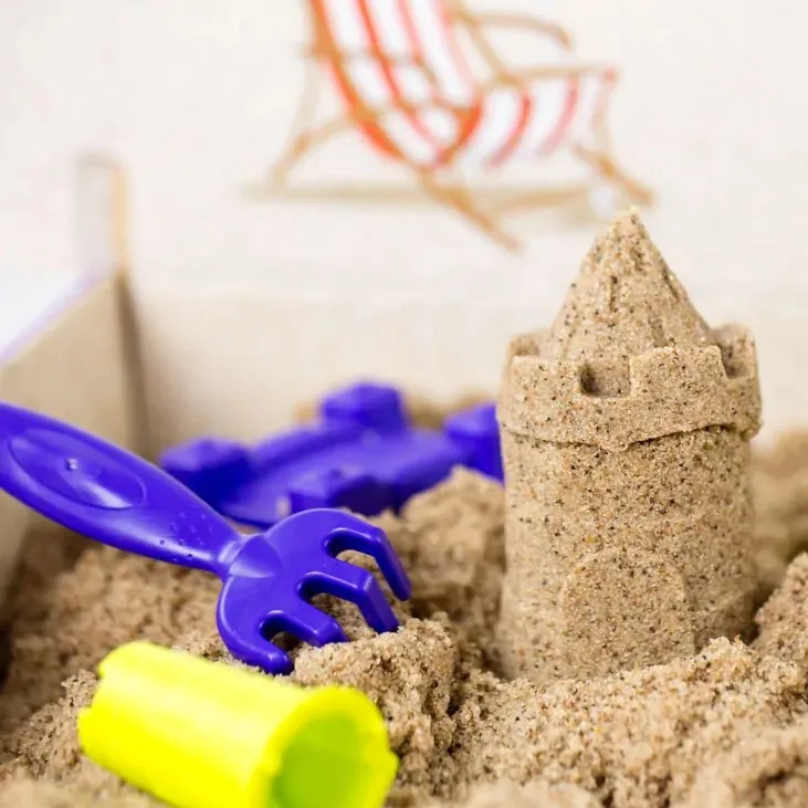Za kuhinjskim stolom Mia s osmijehom uranja ruke u kinetic sand. „Kladim se da nećeš napraviti viši toranj, Tom!” Tom se smije i uzima ljubičastu grabljicu. „Gledaj – moj dvorac imat će jarak i garažu!” Mia se smije. „Tko zadnji završi, čisti. Spreman za dvoboj dvoraca?”