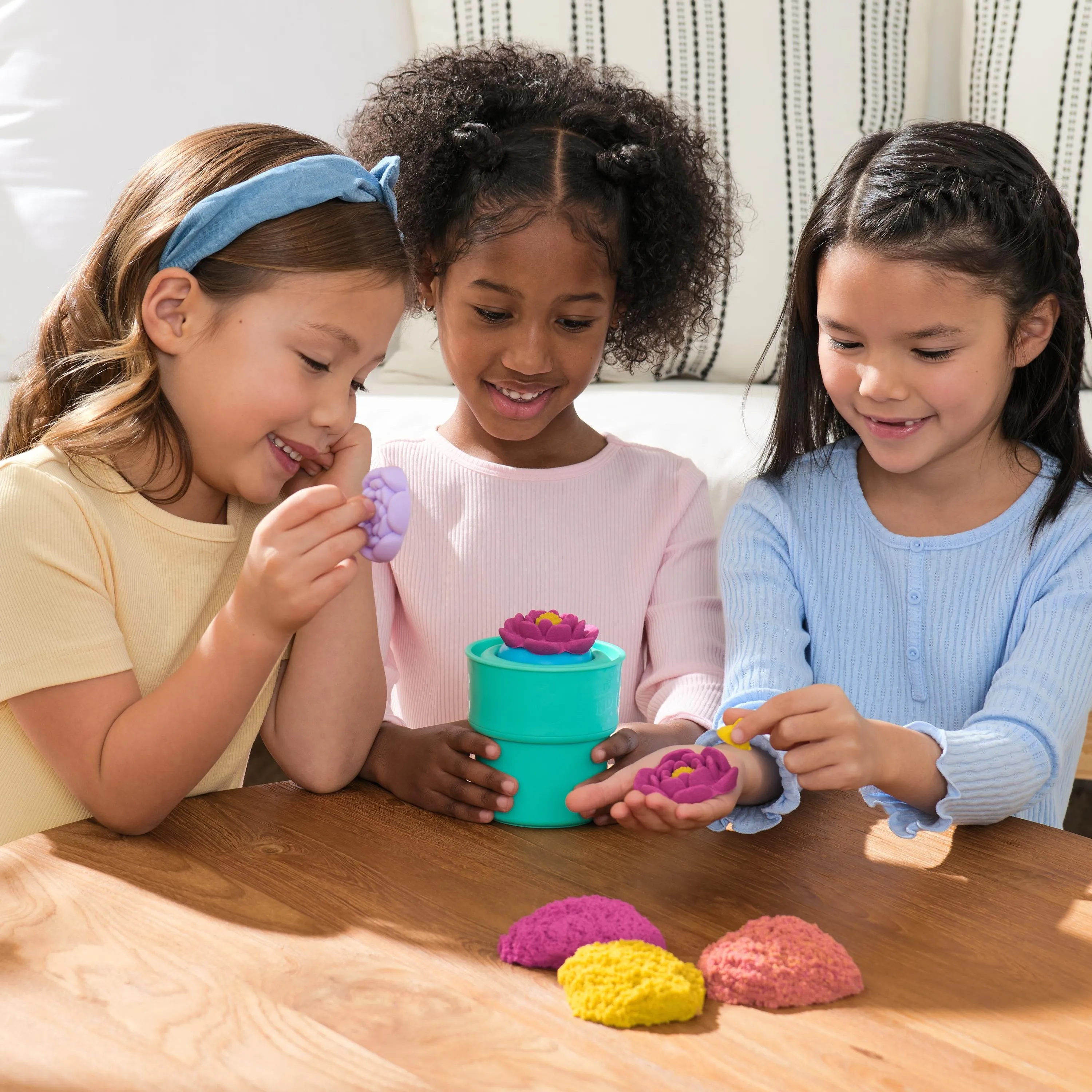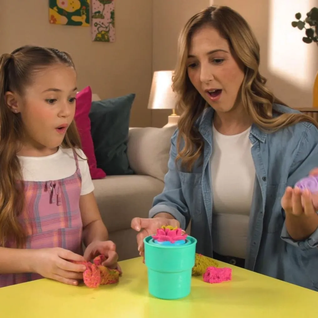 Za kuhinjskim stolom Mia se smije dok joj ljubičasti Kinetic Sand klizi kroz prste. „Kladim se da ću danas napraviti veći cvijet nego jučer!” kaže. Prijatelj Eli se smiješi: „Samo da ti opet ne odleti kalup za pčelicu!” Smijući se pune kalup pijeskom. „Spremni? Pogledajmo čiji će cvijet danas najljepše procvjetati!”