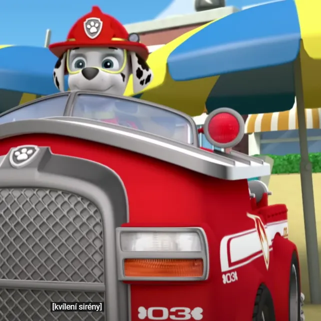 Kraj šatora sa šarenim krovovima Marshall provjerava ljestve na svom vatrogasnom vozilu. „Uvijek spreman za akciju!” laje. Ryder viče: „Marshall, mačić je zapeo na hrastu!” Marshall se nasmiješi: „Idem odmah!” Juri spasiti Macu sa stabla.