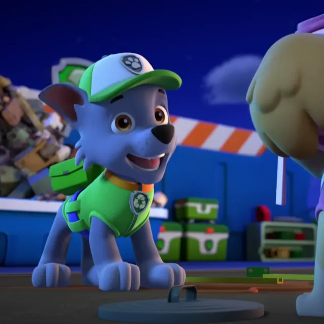 Uz naslagane sanduke na reciklažnom dvorištu Adventure Baya, Rocky kaže: „Brzo sortirajmo, Adventure Bay nas treba!” Skye slijeće uz smijeh: „Tko će zadnju limenku, Rocky?” Rocky namigne: „Nema prevelikih zadataka, ni previše malih šapa!” Zajedno jure osloboditi blokiranu uličicu prije zore.