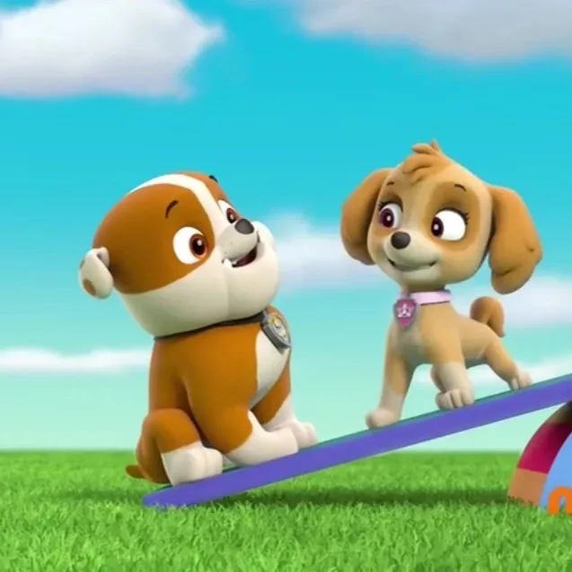 Na zelenoj livadi Rubble kaže: „Kladim se da ću duže izdržati na klackalici od tebe, Skye!” Skye namigne: „Pazi sad, Rubble - lagana sam kao pero!” Klackalica se nagne, Rubble uzvikne: „Jao, padam!” Skye se nasmije: „Idemo pronaći Yuminu svinju!” Oboje kreću u akciju.