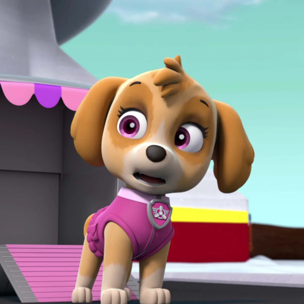 Kod podnožja tornja Skye podiže uši. „Netko je rekao da je mačić zapeo na planini?” pita i namješta naočale. „Spremna sam poletjeti - nijedan zadatak nije prevelik, nijedan psić premalen!” S odlučnošću kreće po rampi prema spašavanju.