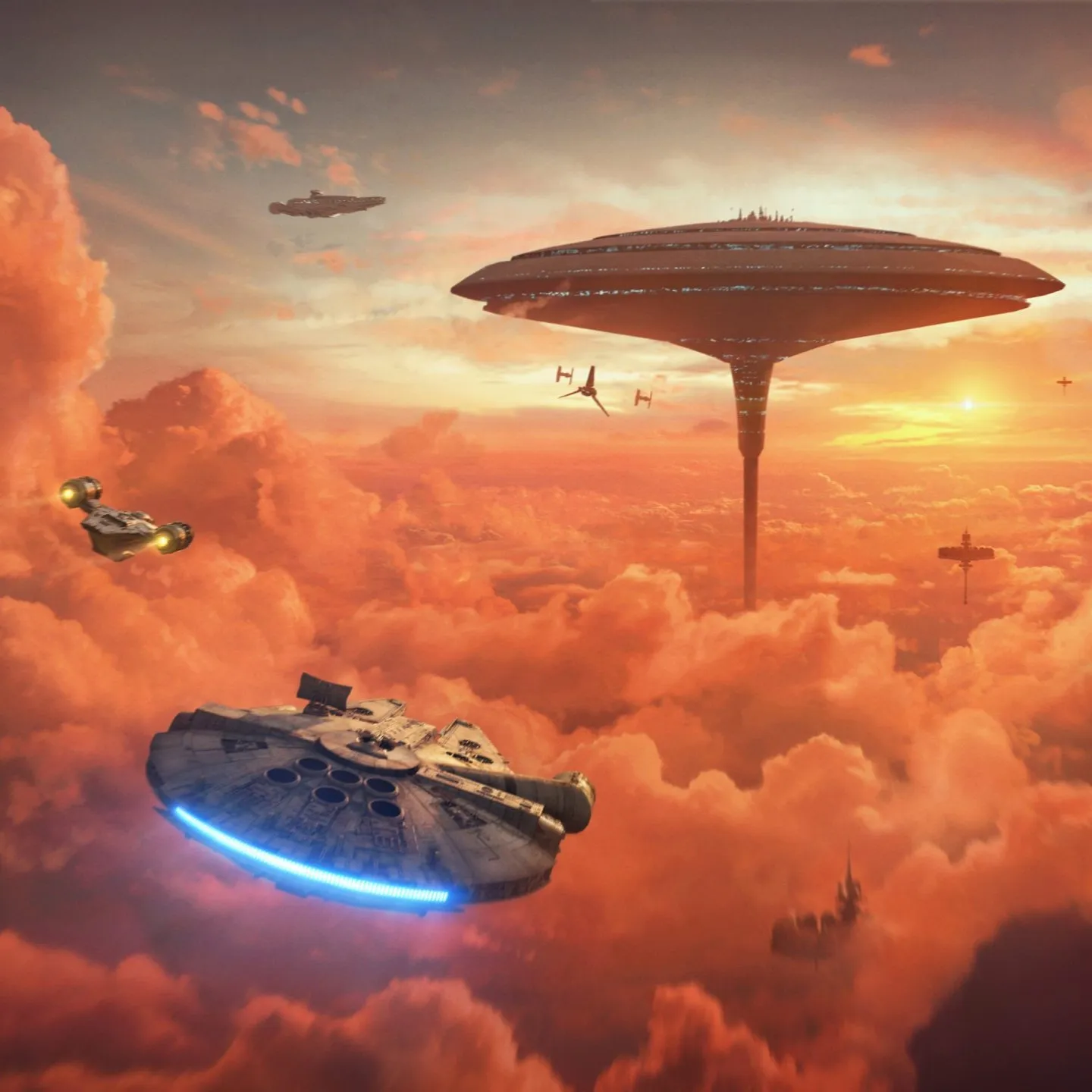 U kokpitu Han Solo se smiješi: „Chewie, ubrzaj! TIE lovci su nam za repom.” Chewbacca gunđa i pritišće tipke. Leia se naginje: „Ako ste gotovi s hvalisanjem, treba nam dozvola za slijetanje.” Han namigne: „Opusti se, princezo. Što može poći po zlu?” Lando na radiju: „Dobrodošli u Cloud City! Sad zaobiđite patrole!”