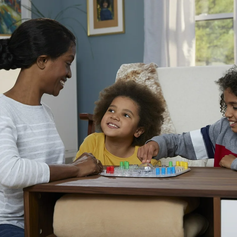 Za drvenim stolom Jana se smije: „Ako pobijedim, Tomo pere suđe!” Tomo pritišće balon, smije se: „Samo ako me stigneš!” Mama Petra namiguje: „Pobjednik bira pizzu večeras.” Janina figurica juri naprijed. Tomo viče: „Neriješeno ako izgubiš, vrijedi?” Smijeh ispunjava sobu, zadnja runda odlučuje o pizzi.