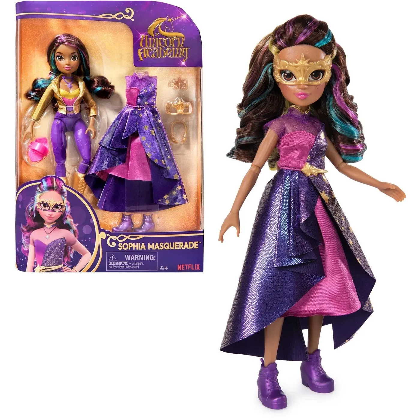 Unicorn Academy deluxe lutka Sofija donosi čaroliju Netflix serije u dječju sobu - ima dugu kosu u duginim bojama, devet pokretnih zglobova i dva potpuna outfita. Djeca mogu češljati njenu kosu, presvlačiti je iz jahaće opreme u blistavu balsku haljinu i smišljati beskrajne avanture iz svijeta Unicorn Academy.