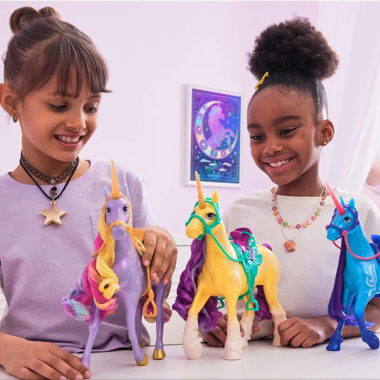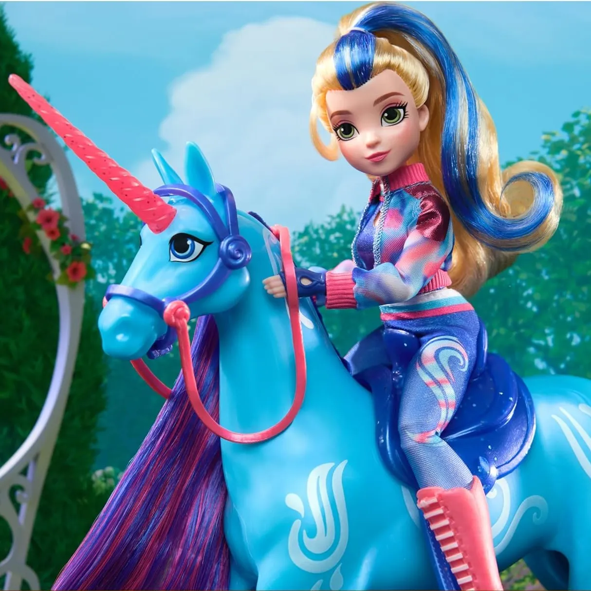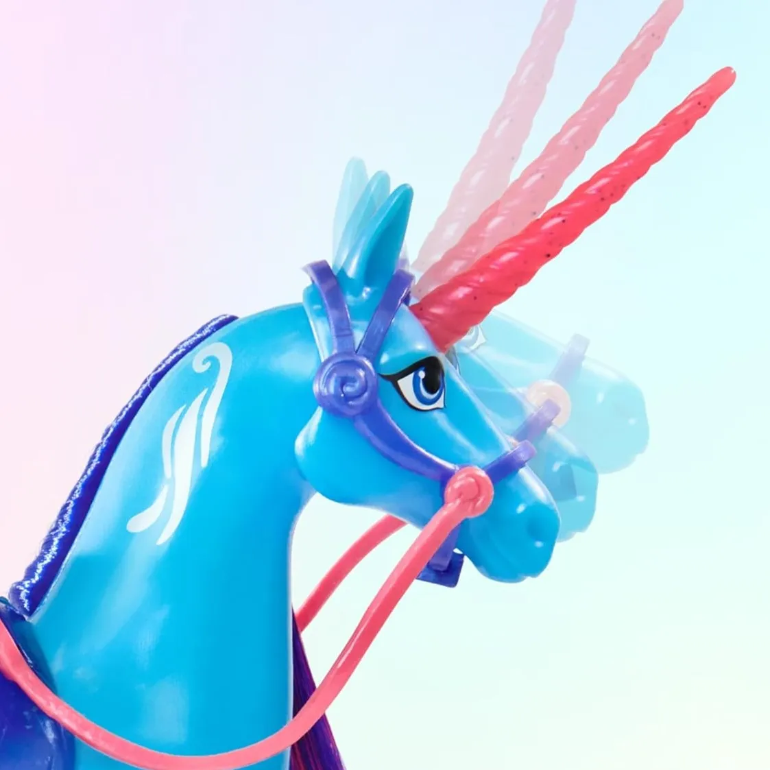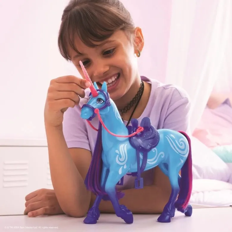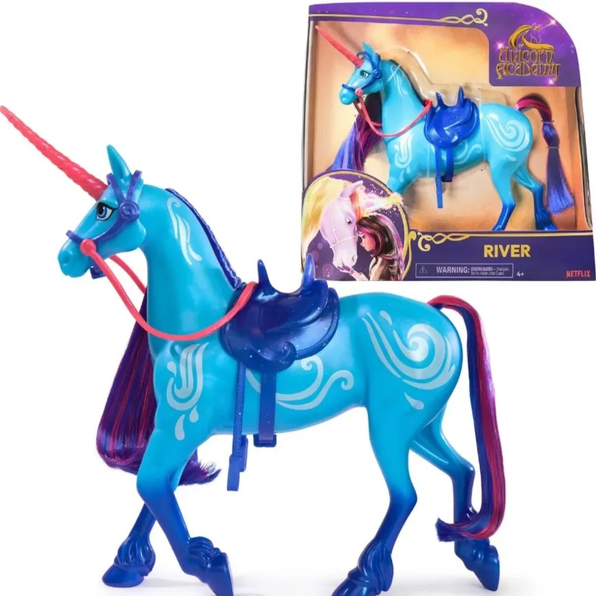 Jednorog River iz Unicorn Academy ima sjajnu plavo-ružičastu grivu, blistav rog i odvojivo sedlo. Pomicanje glave i češljiva griva oživljavaju priče iz Netflix crtića, a djeca mogu smišljati vlastite avanture. Vjerni detalji i veza s Isabel potiču maštovitu igru.